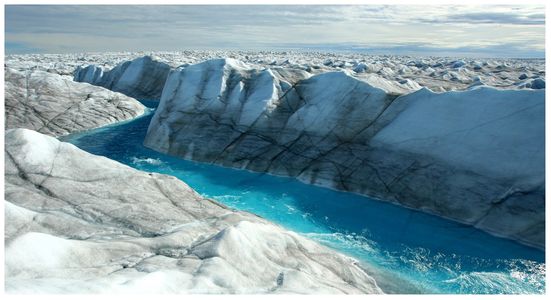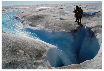 Greenland’s melt-water pours down Moulins to the base of the ice sheet up to 3 kilometers (9,800 ft) deep, enhances glacier flow by reducing ice sheet friction, and then flows to the sea.