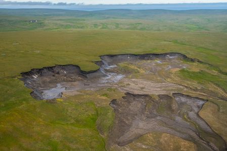 Permafrost can contain large amounts of ice incorporated during the last glacial period - 12,000 years ago. As the permafrost thaws, the ice melts, and the ground collapses greatly enhancing the quantity of greenhouse gases being emitted to the atmosphere.